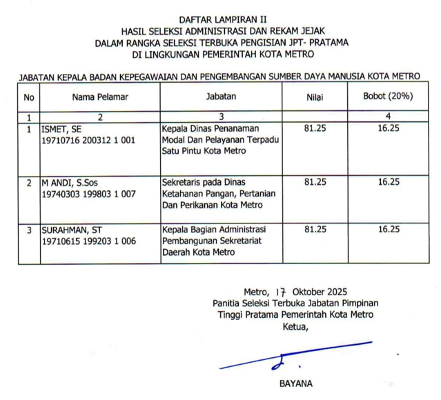 Di mana dari 8 peserta yang mendaftar hanya 3 yang dinyatakan lolos berkas administrasi. Adapun ketiganya yakni Kepala Dinas Penanaman Modal dan Pelayanan Terpadu Satu Pintu (DPM-PTSP) Kota Metro Ismet.